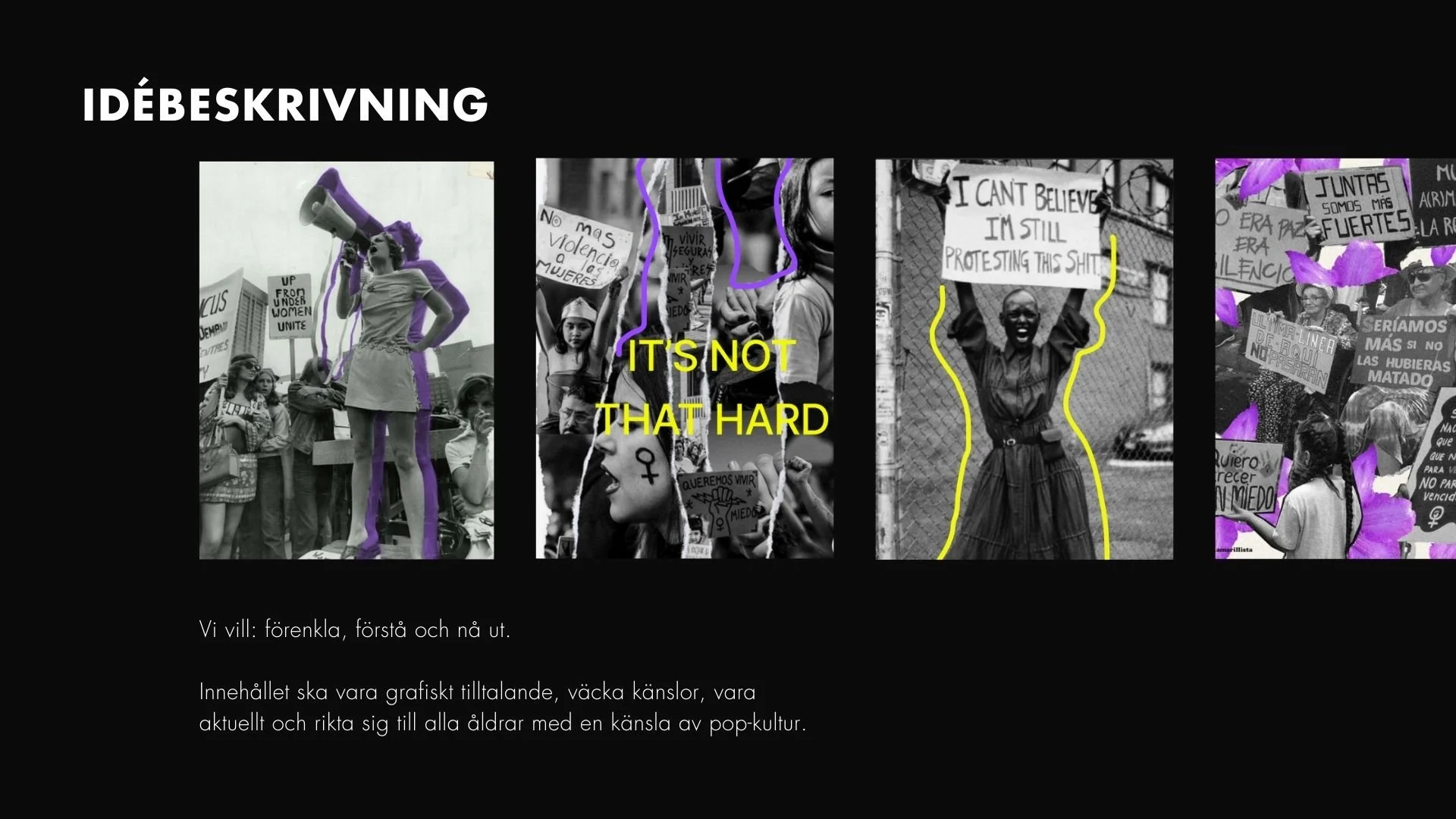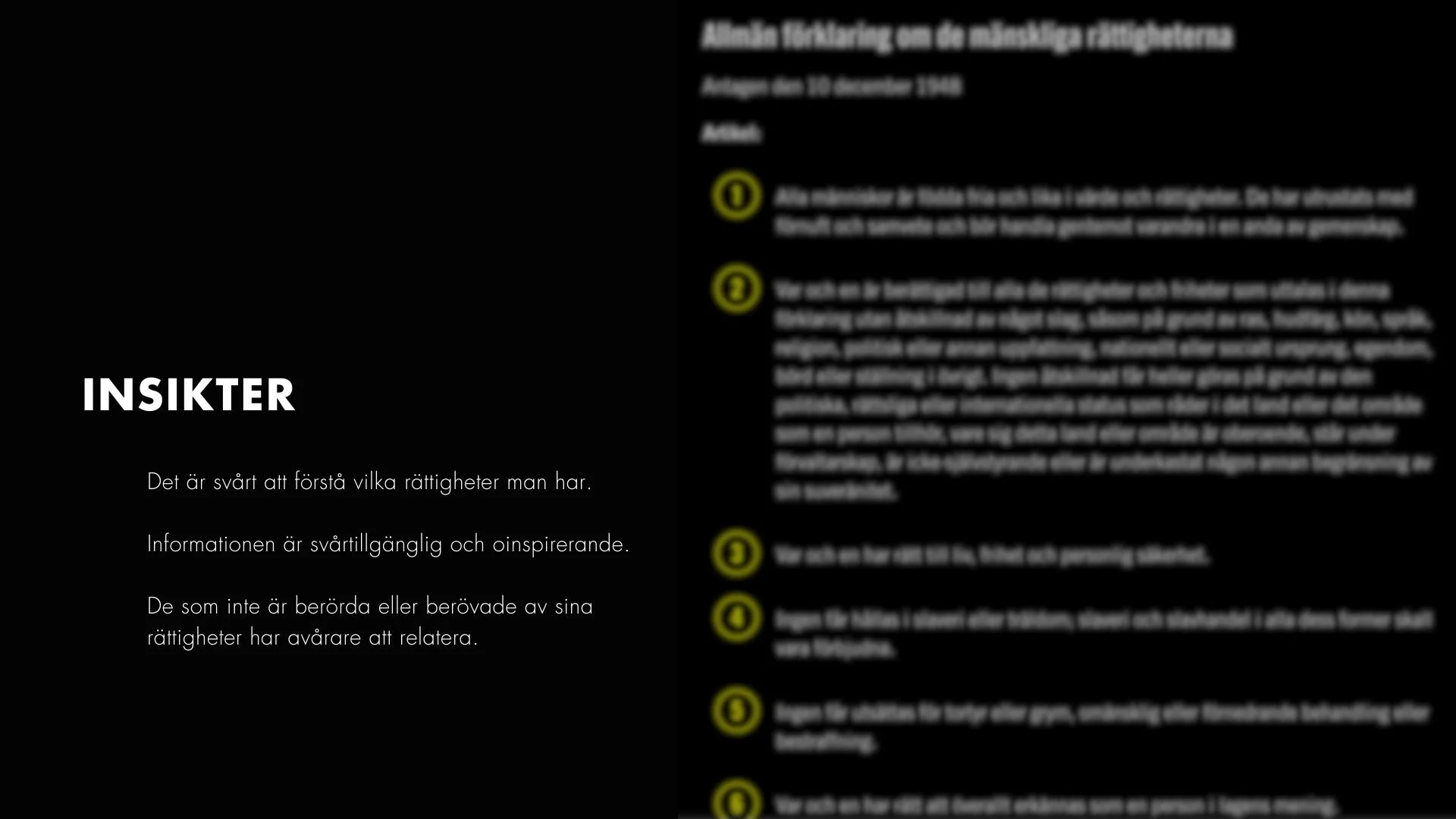 Resultat: Projektet vi skapade blev ett av två som valdes ut för framförande vid event under MR (Mänskliga Rättigheternas) dagarna den 24-25 november i Helsingborg, samt projektets egna event den 9 december på ABF-huset i Stockholm.